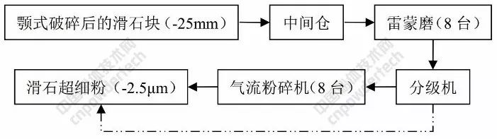 目前,滑石的粉碎加工主要采用干法工藝,濕法粉碎雖有研究,但工業(yè)上很少使用。